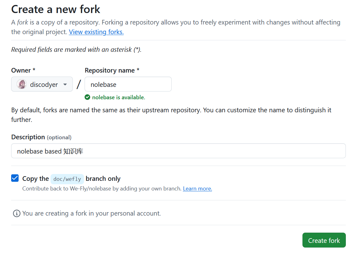 然后fork仓库的doc/wefly分支,这个分支是发布分支,点击右下角的Create Fork按钮就会在你的用户下创建一个仓库