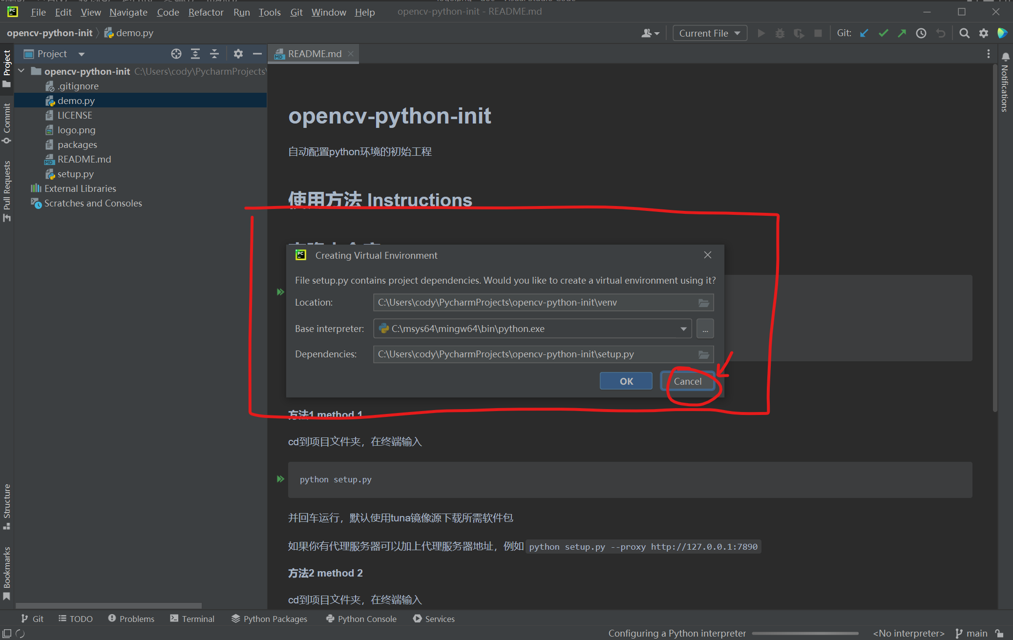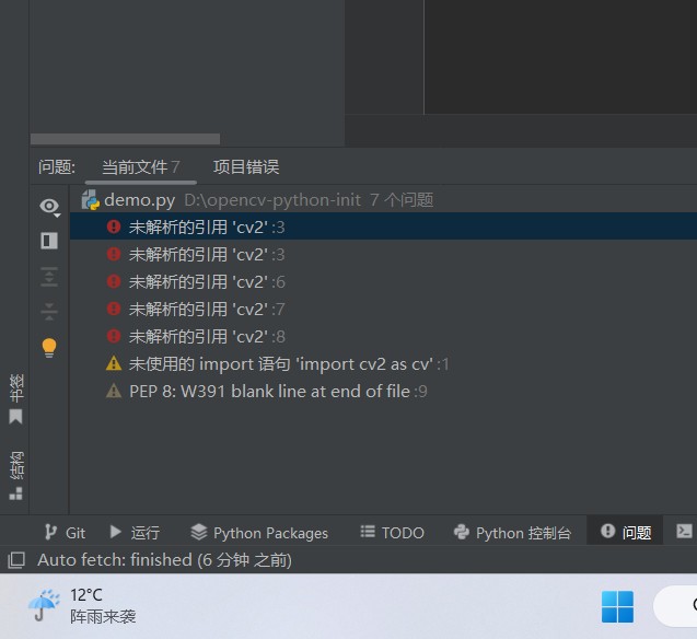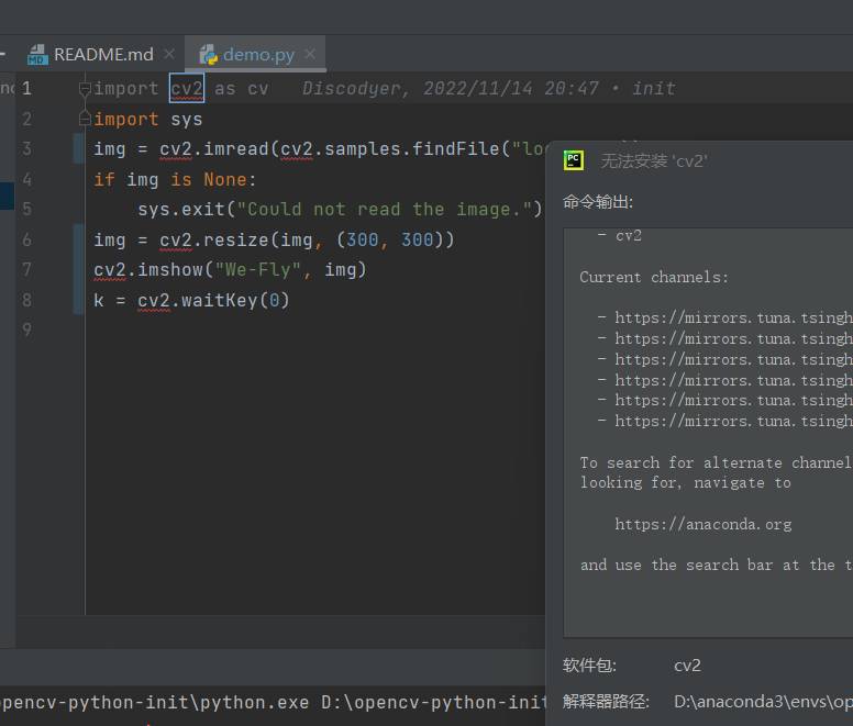 python setup.py的时候,你将opencv软件包安装到了opencv这个环境下,而当前右下角的conda-python-init环境没有opencv软件包