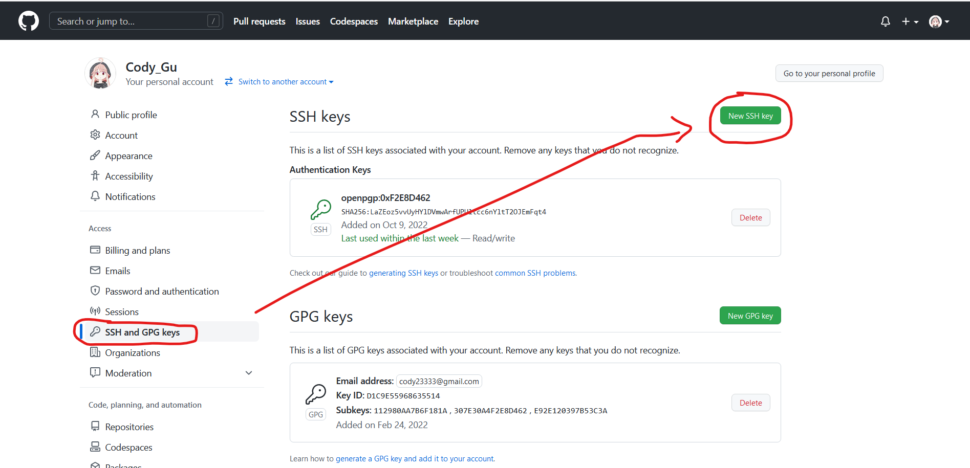 然后点击左侧的SSH and GPG keys选项卡,然后点击右侧的NEW SSH key按钮